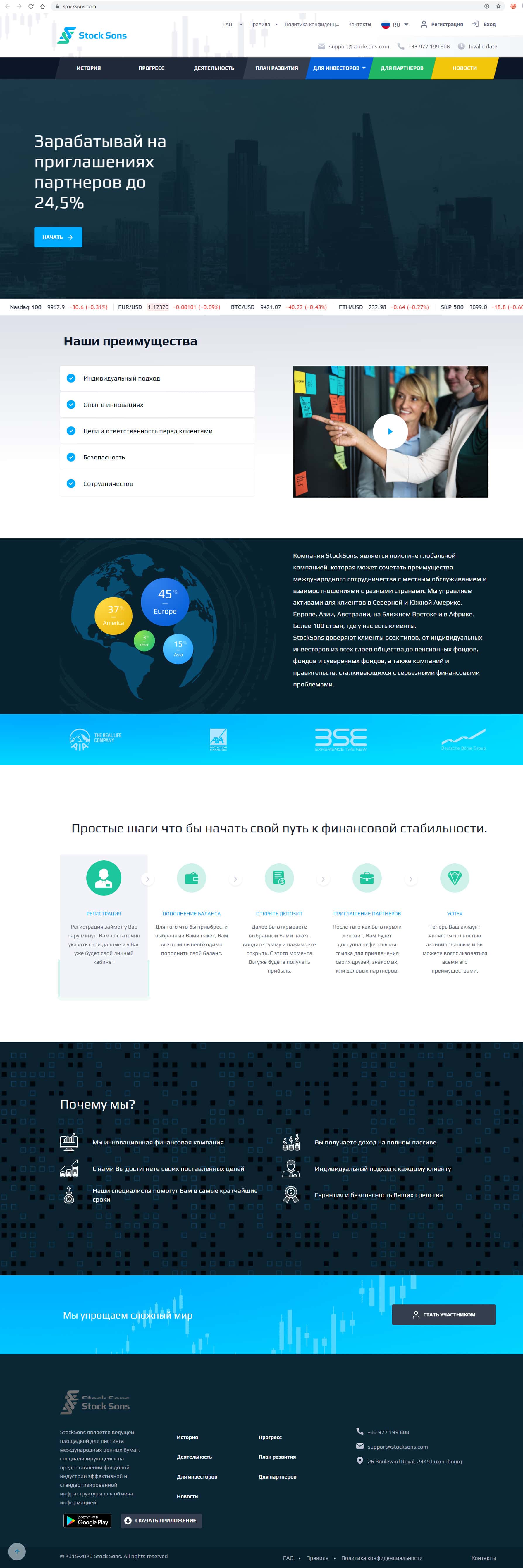 Официальный ресурс Stock Sons в интернете оформлен достаточно стандартно, для подобного рода лохотроных контор. Главная страница пестрит рекламой их достоинств, однако верить ни единому слову мошенников нельзя, они обманут Вас и глазом не моргнут.