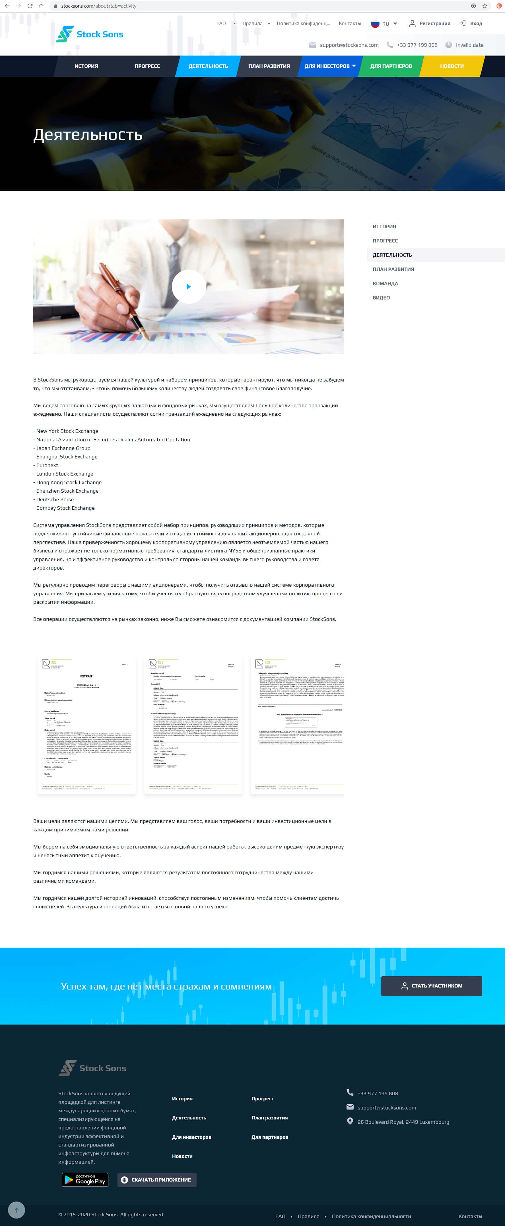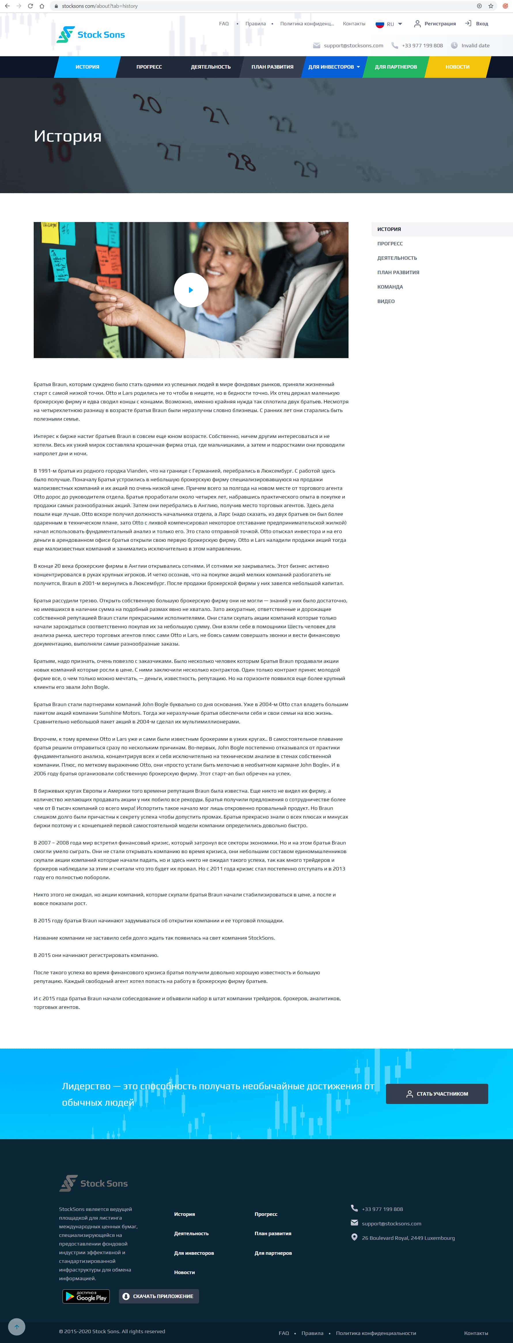 Первым разделом аферисты написали о себе фантастическую историю их создания, в которой конечно же нет ни одного слова правды. Не позволяйте вешать Вам на уши лапшу, компания StockSons - АФЕРИСТЫ !!! Вложенные деньги обратно Вы не получите. ОСТОРОЖНО !!!