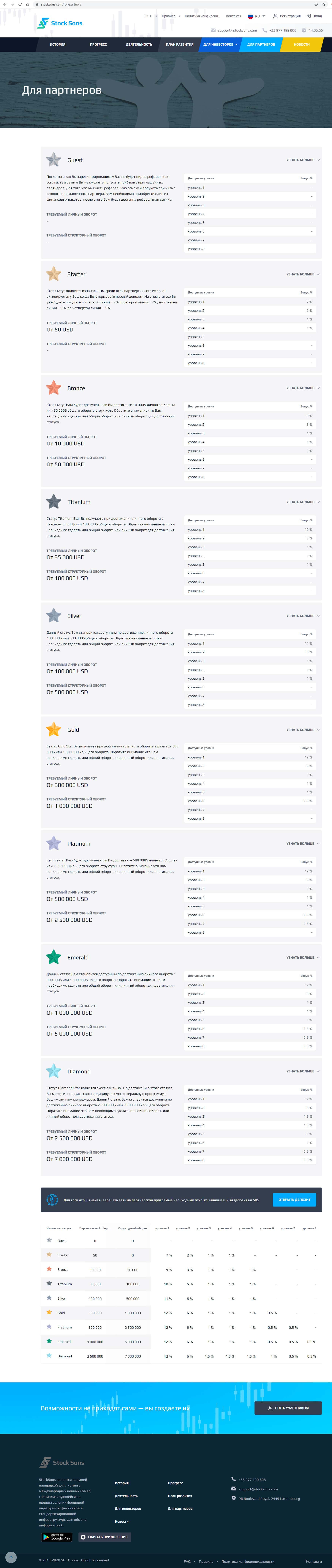 На сайте обманщиков можно также просмотреть информацию для партнеров. Но здесь Вы не найдете ничего конкретного, кроме сведений при каком балансе на депозите Вам будет присвоен следующий статус, который открывает дополнительные преимущества.