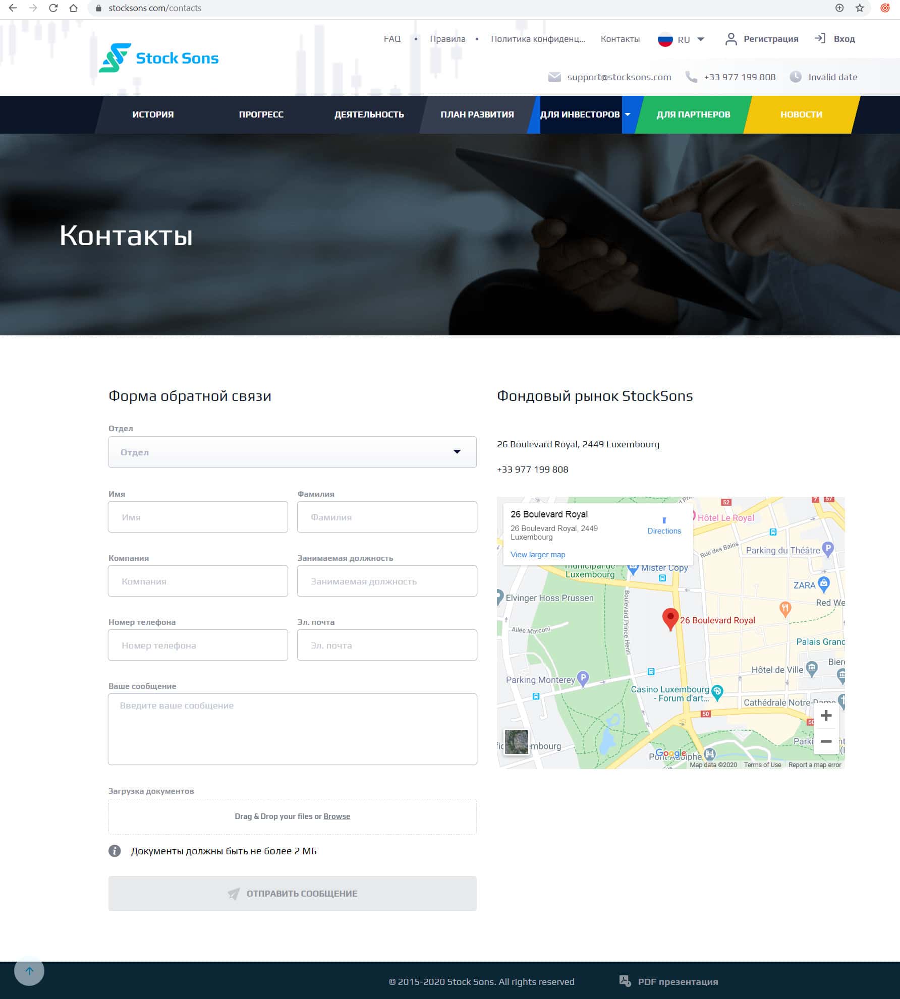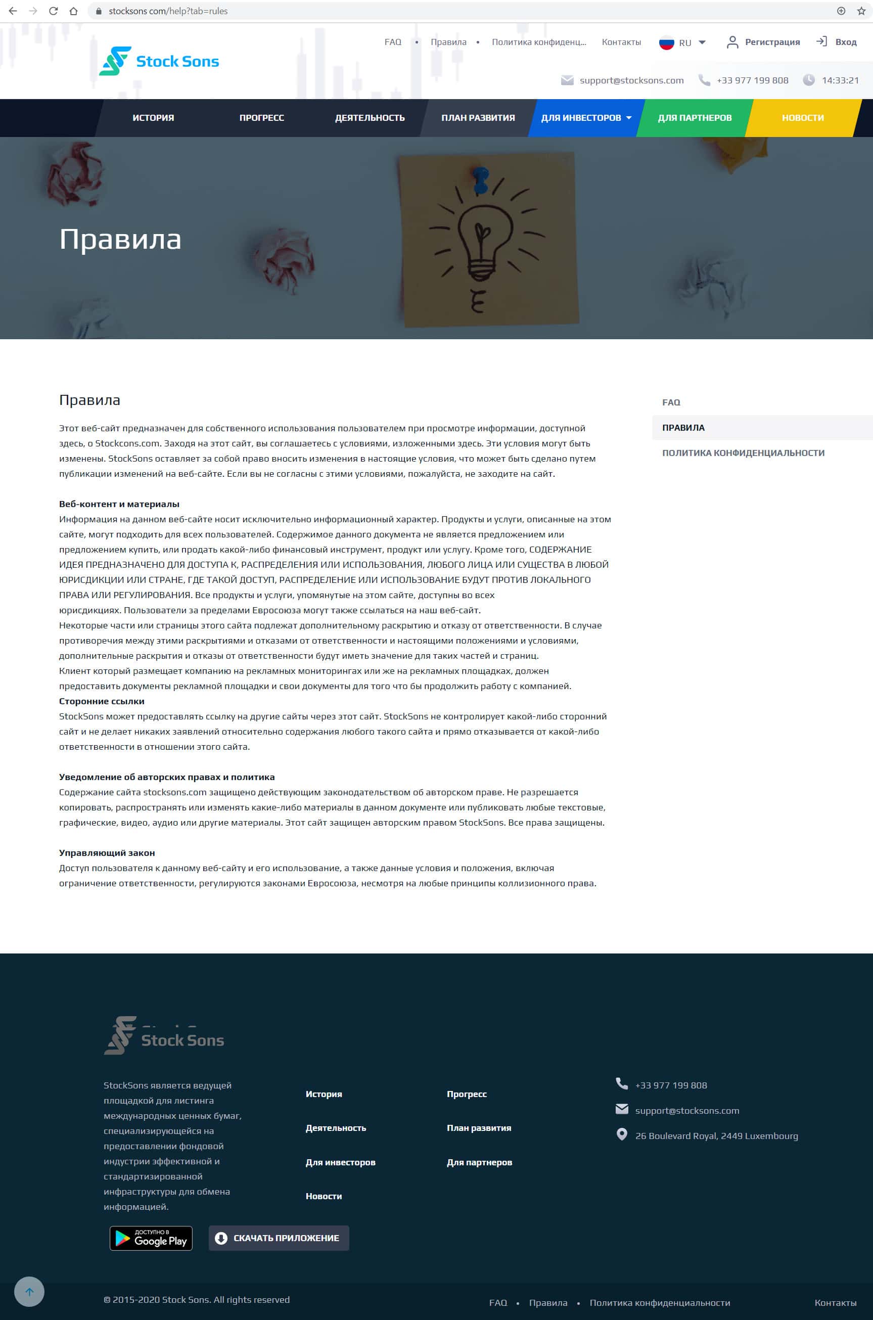 Контора Stock Sons не скрывает своей регистрации в оффшоре, но скорее всего он фиктивный. На сайте обозначен е-майл и номер телефона, поэтому с ними можно связаться одним из предложенных способом: