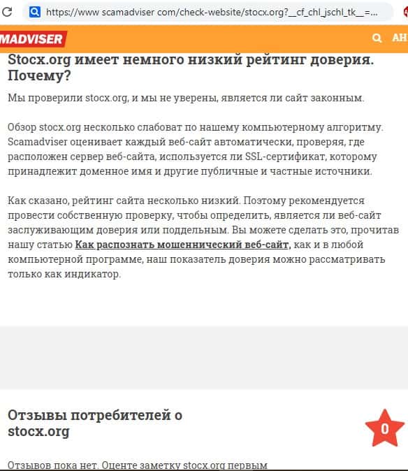 Официальный сайт компании Stocx Org (Stocx Biz) имеет довольно низкий рейтинг доверия