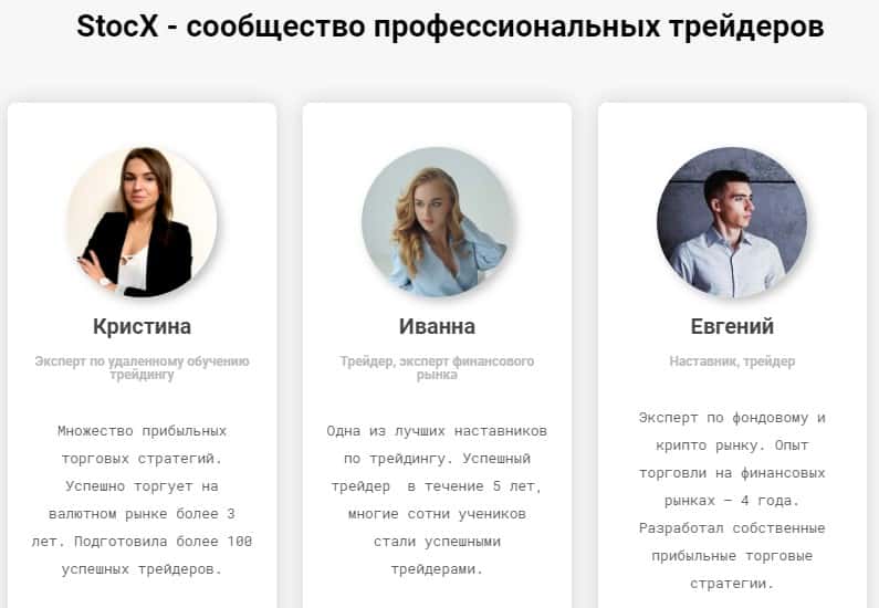 На главной странице консалтинговой организации Stocx Biz приведены фотографии и персональные резюме, якобы, ведущих специалистов в области обучения трейдингу в компании Сток Икс. Неизвестно, насколько реальны эти персоналии, но их резюме, честно говоря, не впечатляют.