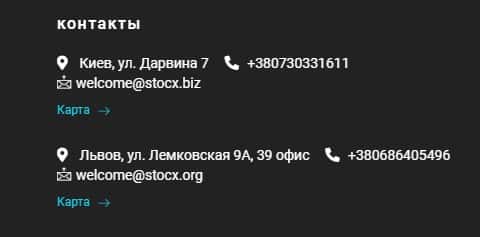 Для связи потенциальных клиентов и трейдеров с украинской консалтинговой компанией Stocx Biz на ее официальном сайте предлагается две контактные точки на территории Украины: