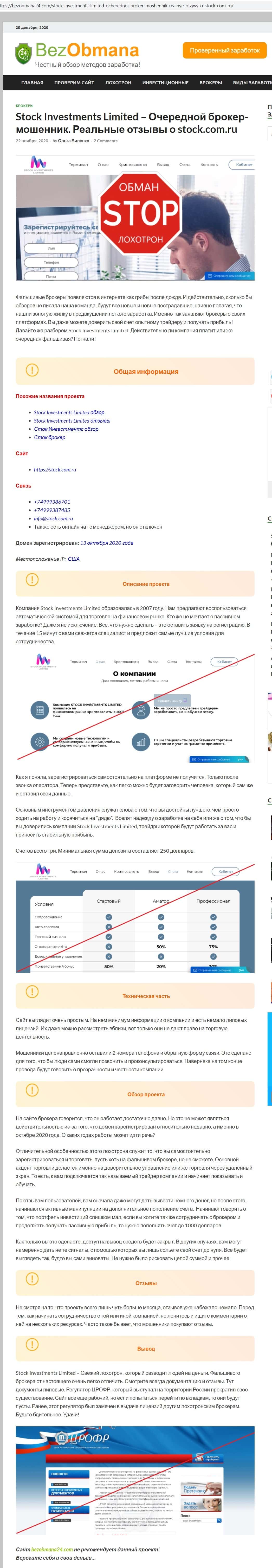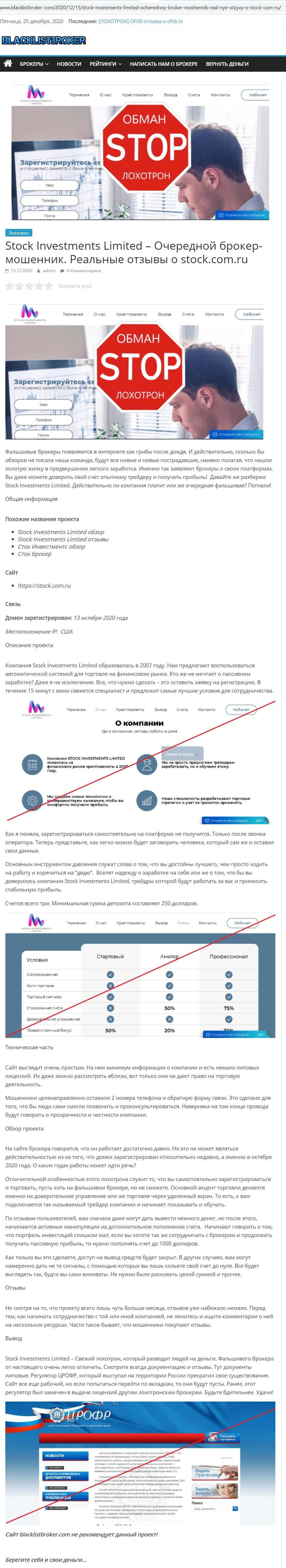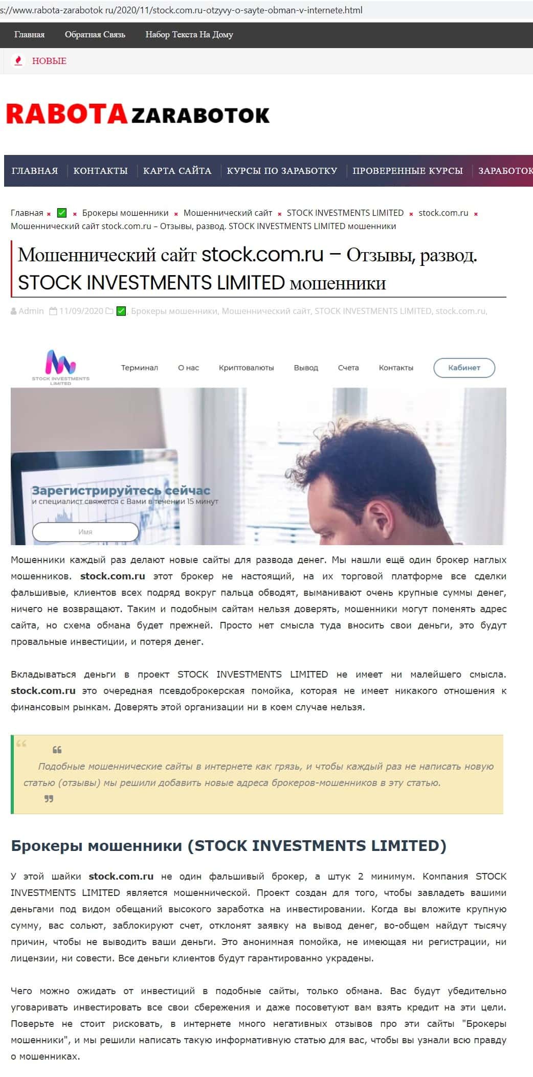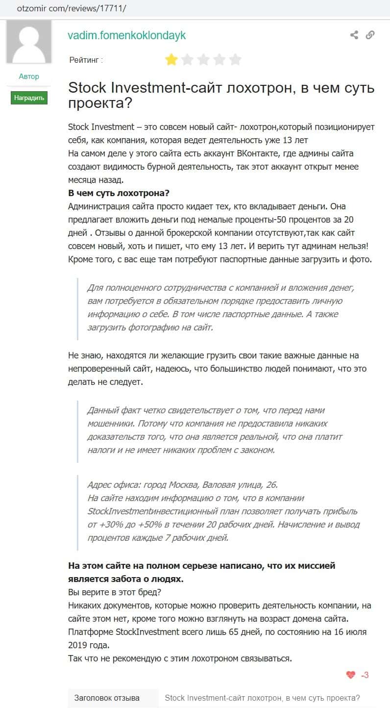 Краткий обзор на сайте otzyvru ru рассказывает о том, что Stock Investments Limited - всего лишь жалкие мошенники, создавшие свой грязный лохотрон с целью обмана народа.