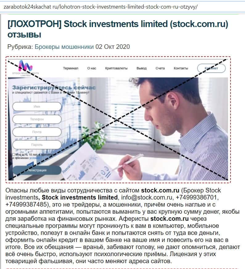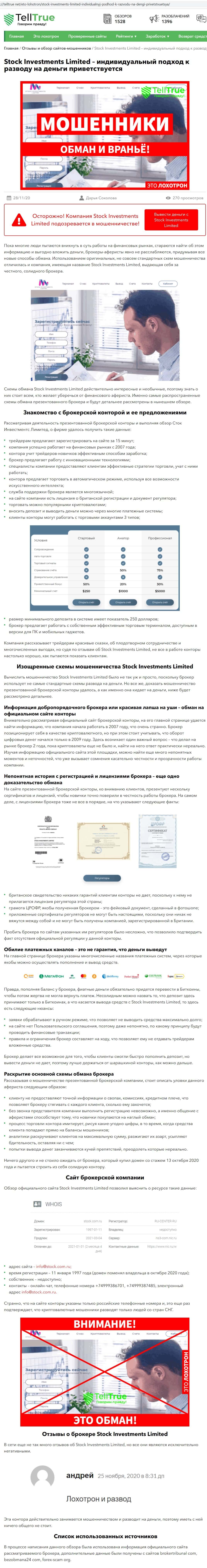 Материал на сайте telltrue net в подробностях описывает лживую контору Сток Инвестментс Лимитед и рассказывает о схемах, применяемых мошенниками для обмана.