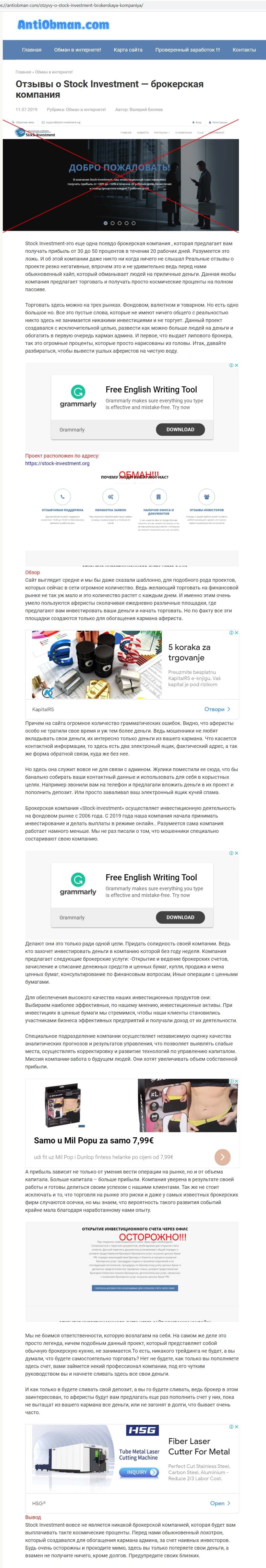 Сайт antiobman com пишет в своем обзоре о лохотроне Stock Investments Limited, что уже при одном взгляде на ресурс, текст которого написан с ошибками, понятно, что этой фейк.