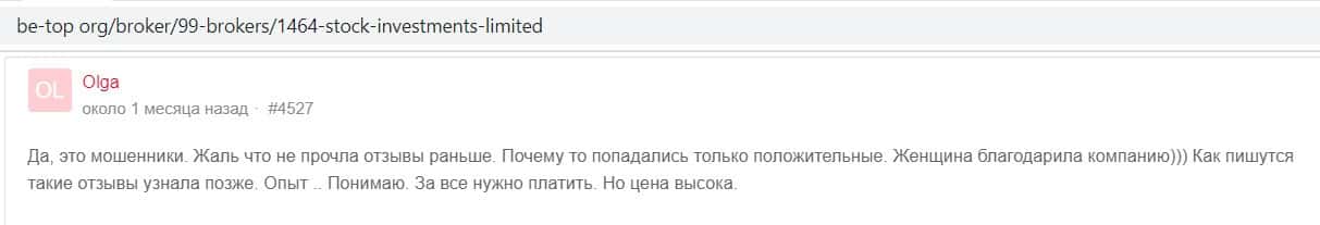 Ольга оставила отзыв, что тоже попала на развод от компании Stock Investments Limited. Прочитала положительные отзывы о ней, а потом поняла, что они поддельные.