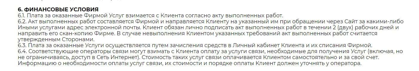 Раздел 6 говорит, что плата за оказанные услуги взимается с клиента согласно акту выполненных работ. Похоже, данный договор жулики скачали неизвестно откуда.
