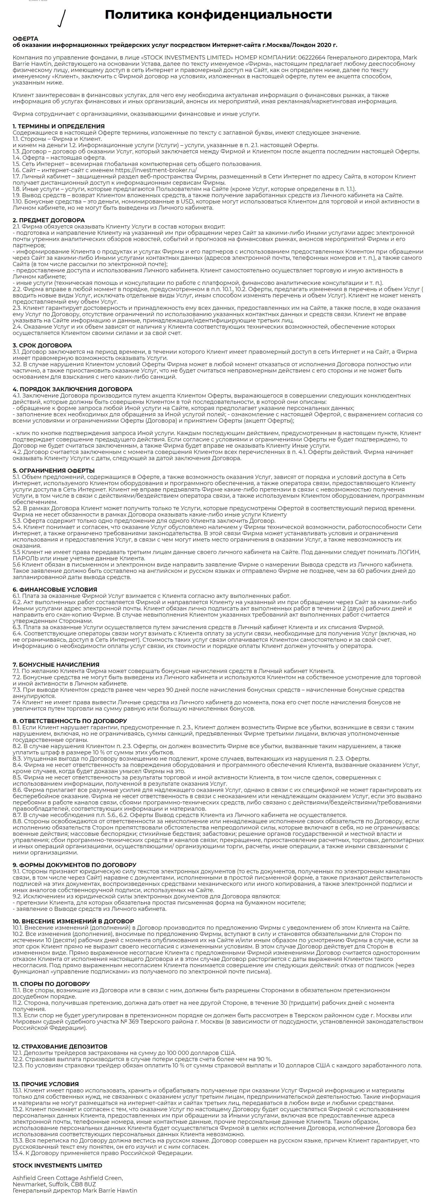 Ниже вы можете прочитать полный текст клиентского соглашения компании Stock Investments Limited.