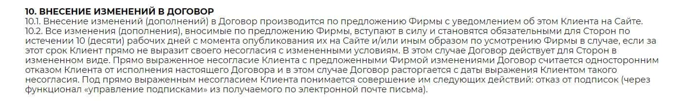 Раздел 10 рассказывает о том, что контора Stock Investments Limited имеет право вносить изменения в данный договор, о чем уведомляет клиента сообщением на сайте.
