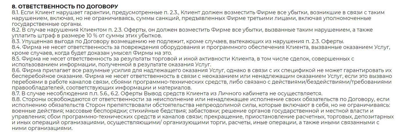 В разделе 8 компания Stock Investments Limited открещивается от любой ответственности за потери клиента на их платформе, а пользователь должен с этим согласится.