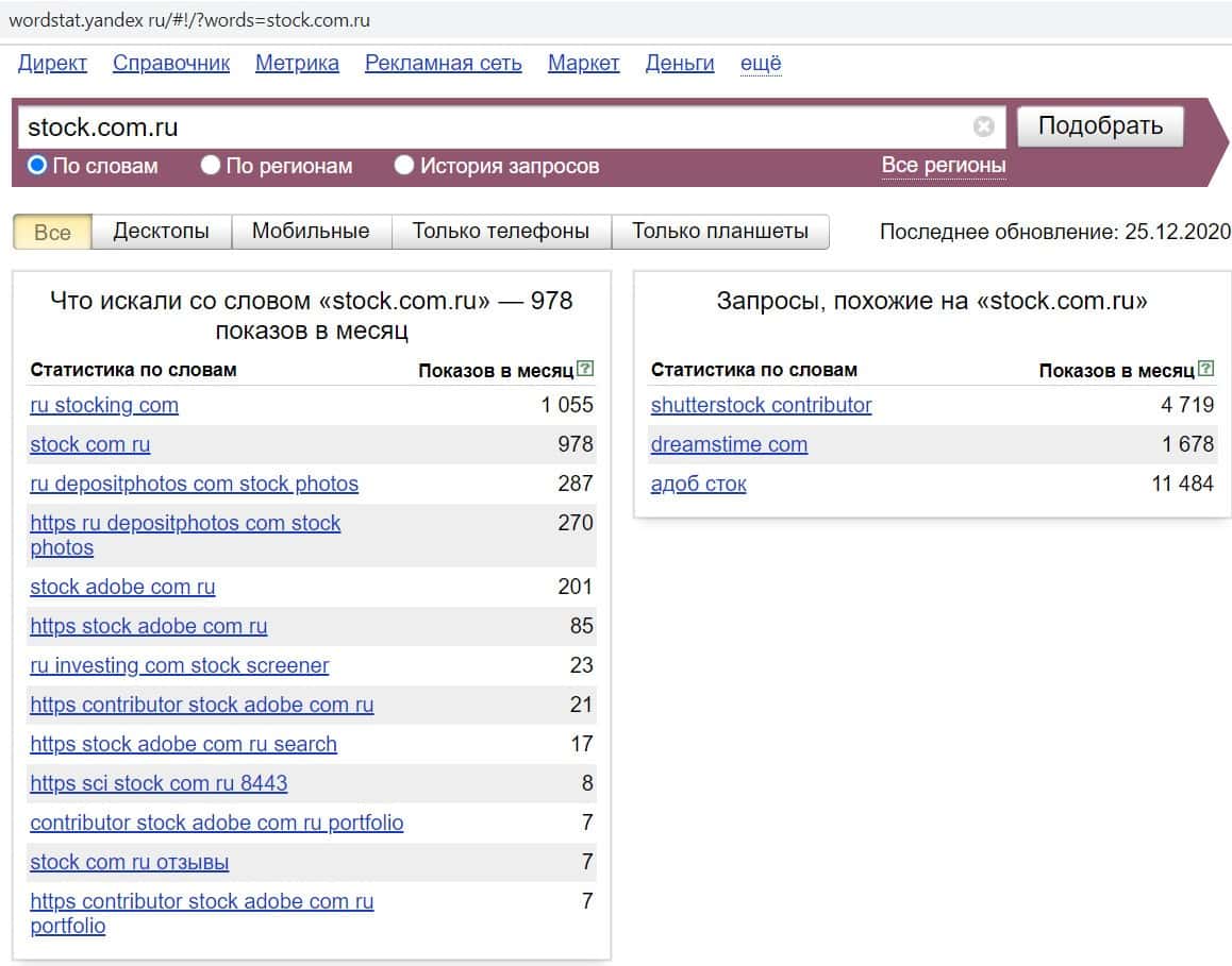 - Количество брендовых запросов в поисковике Яндекс Вордстат по Stock Com Ru