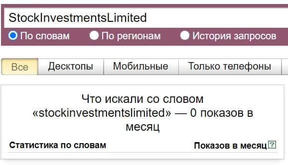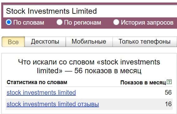 То же название "Stock Investments Limited", но написанное с пробелом, люди пытались найти в системе Яндекс 56 раз.