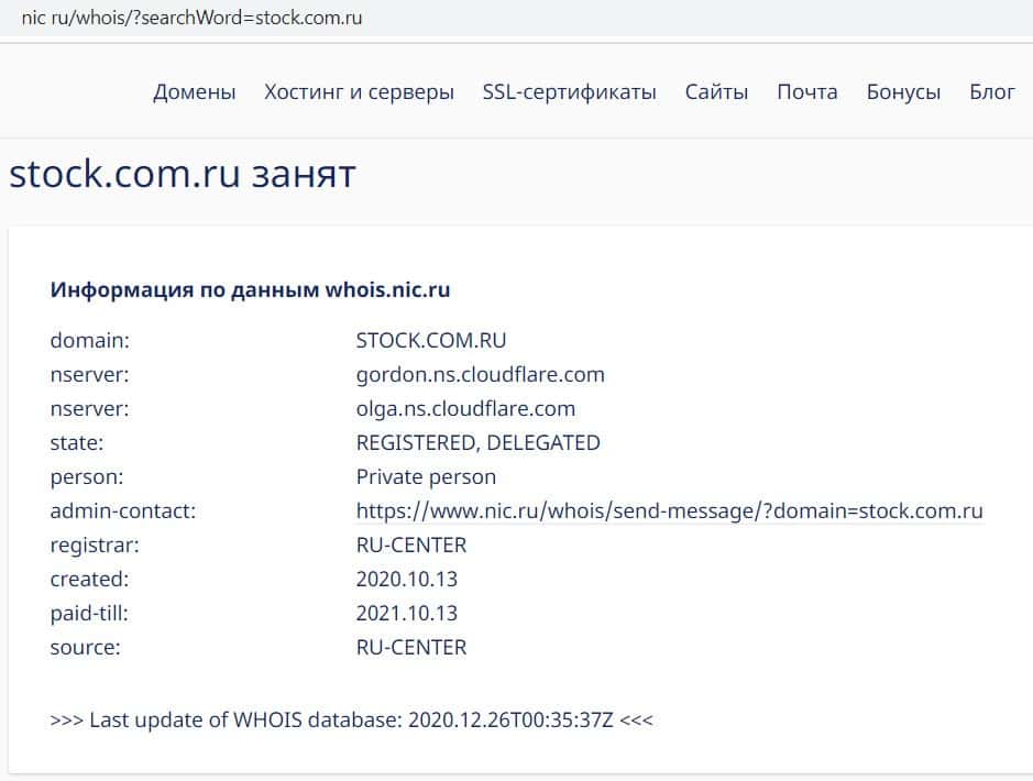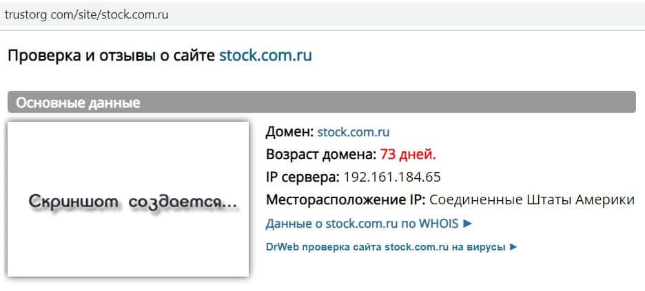 По данным сервиса Трасторг, возраст доменного имени stock com ru составляет всего 73 дня. Мошенники создали свой ресурс менее трех месяцев назад.