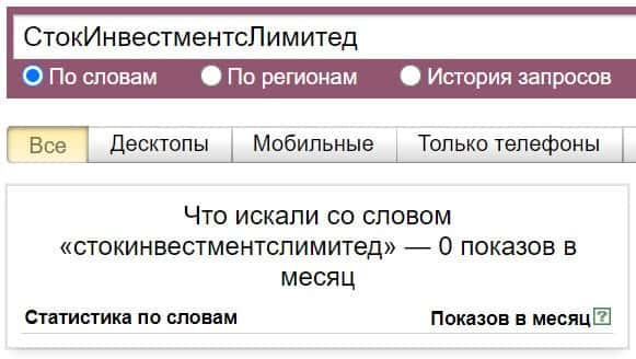 Название мошеннической конторы "StockInvestmentsLimited", написанное на английском языке, пользователи не искали в системе Яндекс ни одного раза за месяц.