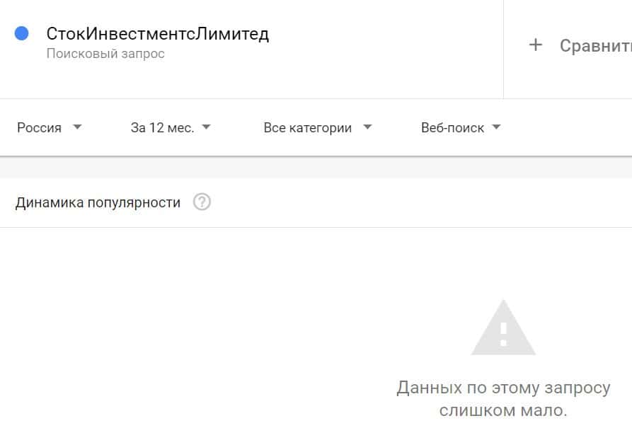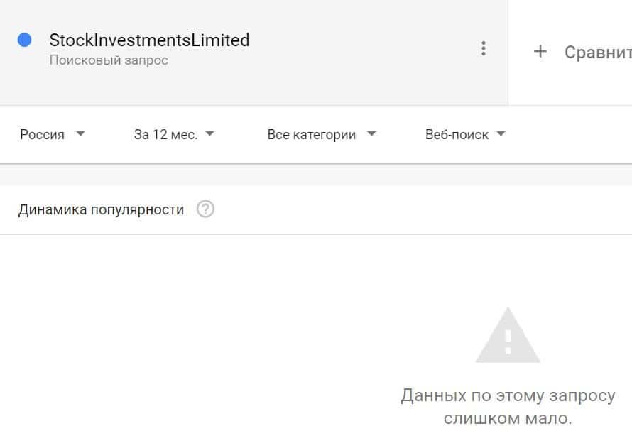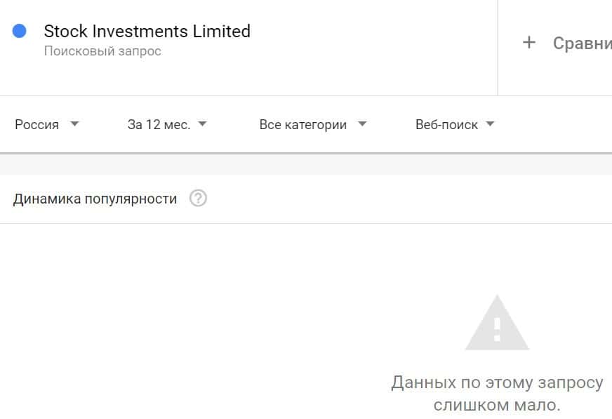 Посмотрим, насколько популярно название бренда "StockInvestmentsLimited", написанное на английском языке. Данных по этому запросу нет, так как никто не искал этот бренд в Гугл.