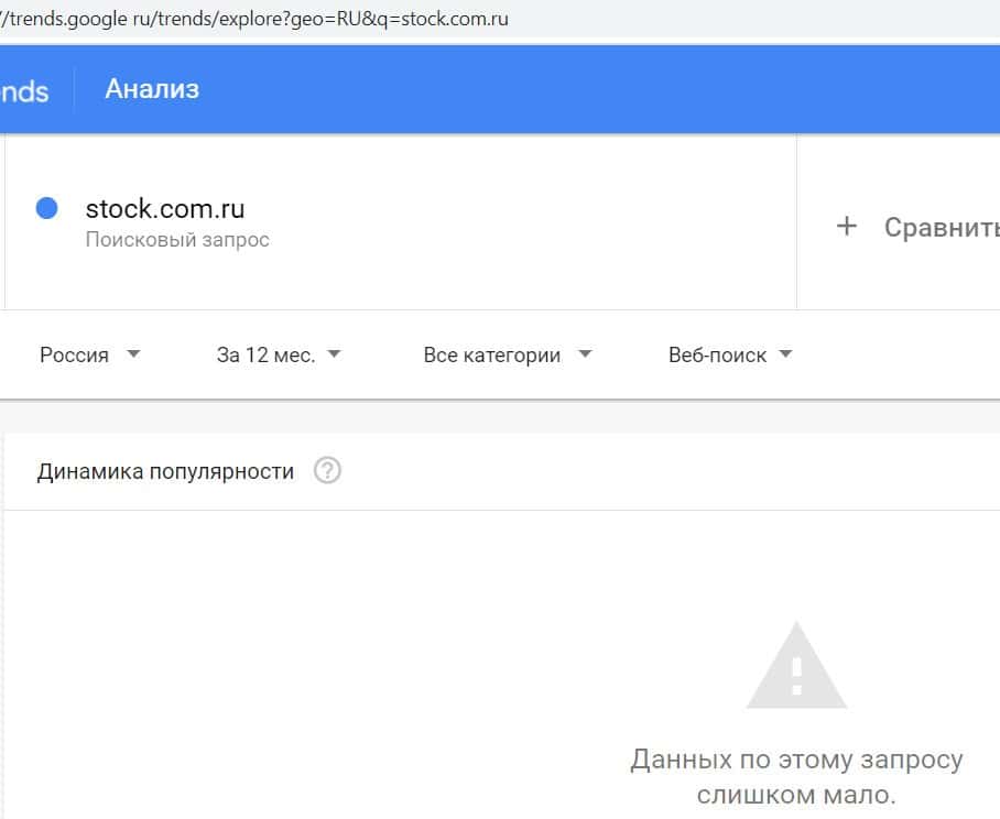 Доменное имя мошеннического сайта "stock.com.ru" пользователи вбивали в поисковую систему Гугл слишком редко, поэтому данных по этому запросу очень мало.