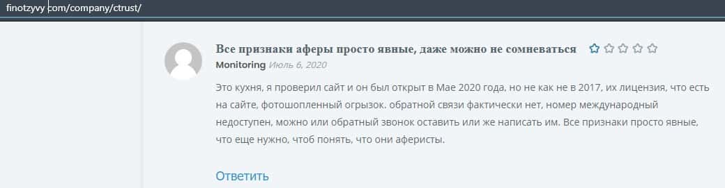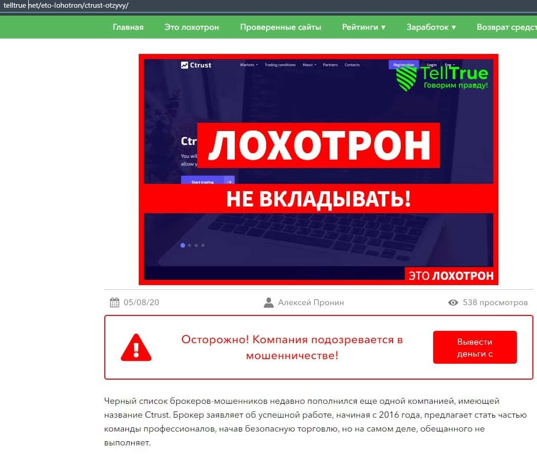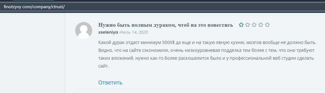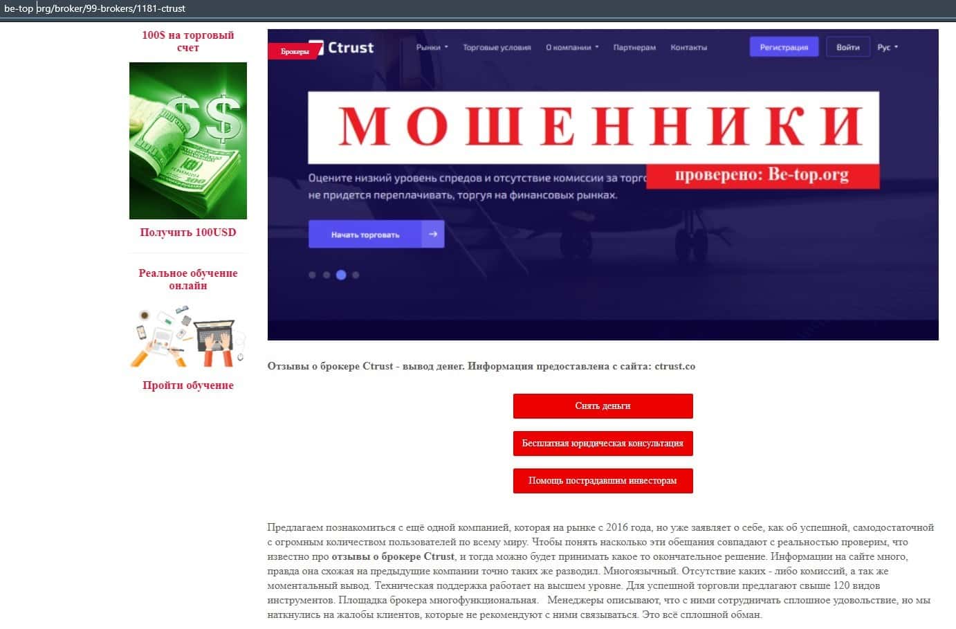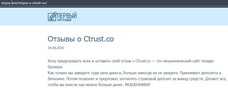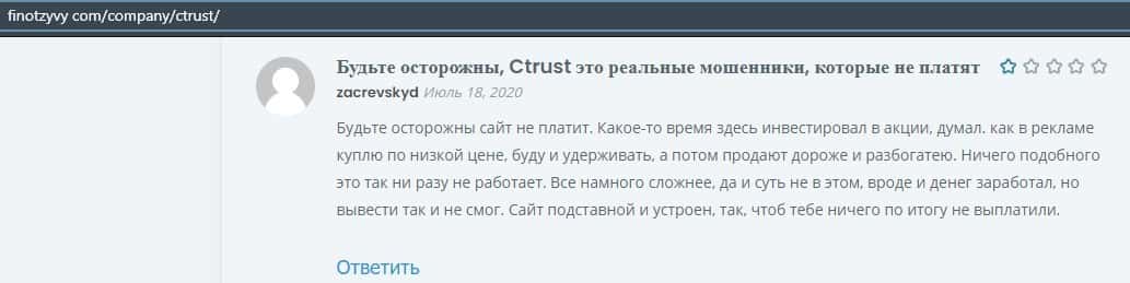 Большинство пользователей сети высказали свое мнение касательно брокерской конторы CTrust Co по их мнению это лохотрон, который так или иначе ворует деньги у наивных клиентов.