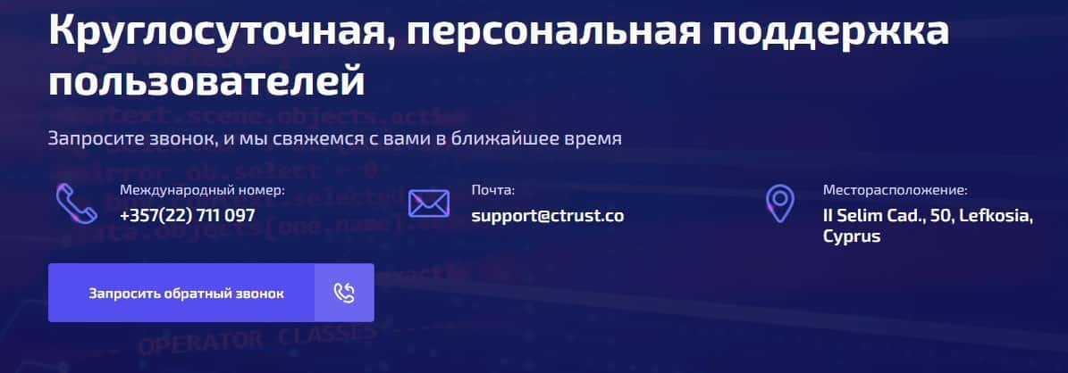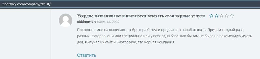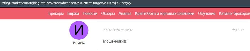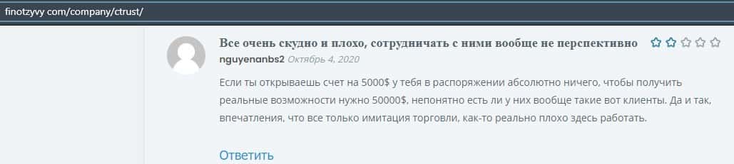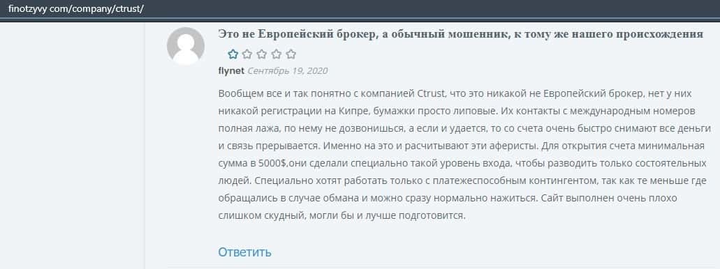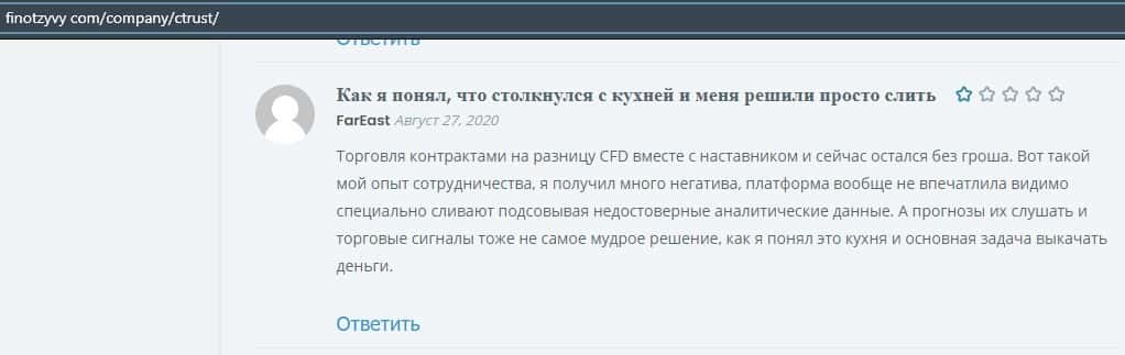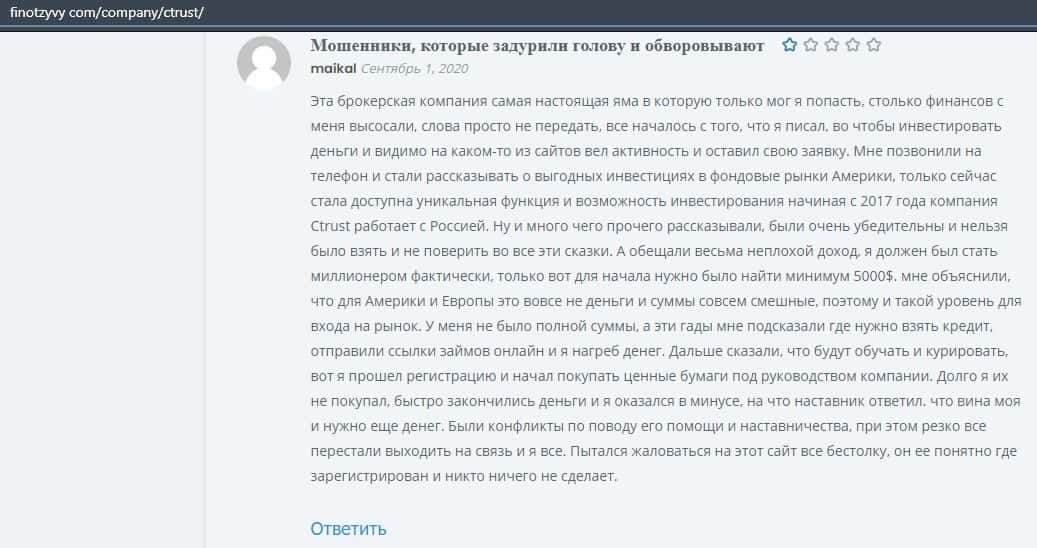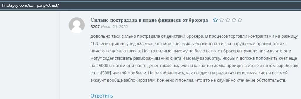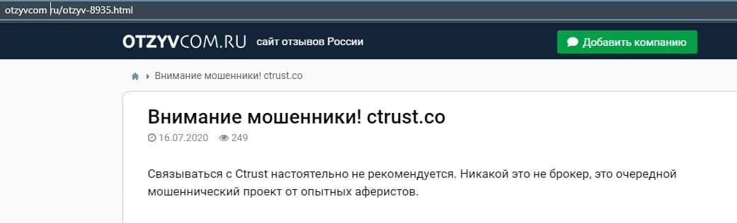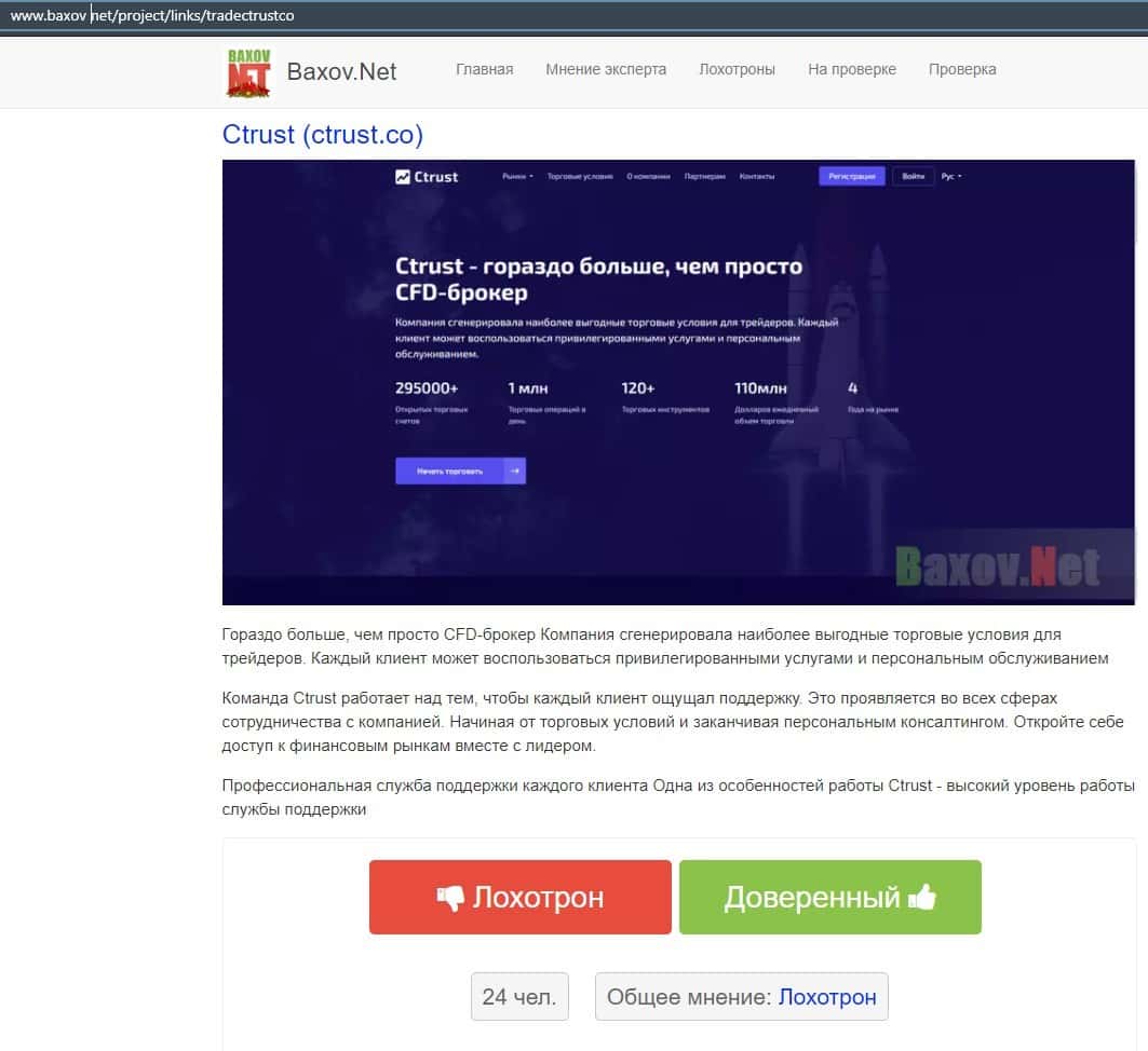 Большинство пользователей сети высказали свое мнение касательно брокерской конторы CTrust Co по их мнению это лохотрон, который так или иначе ворует деньги у наивных клиентов.