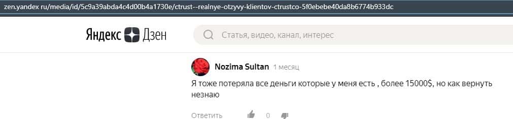 Автор отзыва указал, что он потерял в конторе СТраст более чем 15 000 долларов США и мошенники отказываются ему что-либо возвращать. Они ведут противоправные действия.