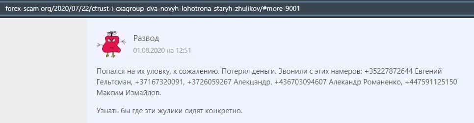 Далее представлена информация о связи лохотрона СТраст с другим мошенническим проектом под названием CXAGroup Net, который также был замечен в преступных схемах.