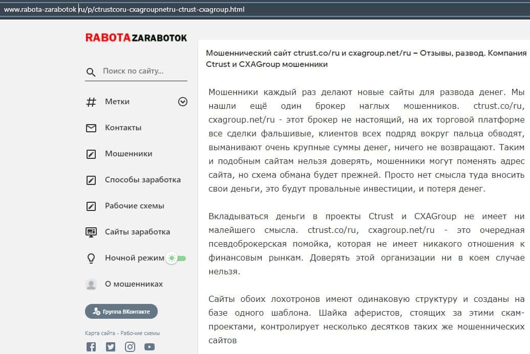 Далее представлена информация о конторе CXAGroup Net,ктоорая тесно связана с аферой СТраст. Это также черный брокер, который слил уже огромное количество наивных клиентов.