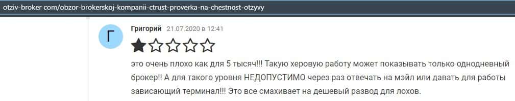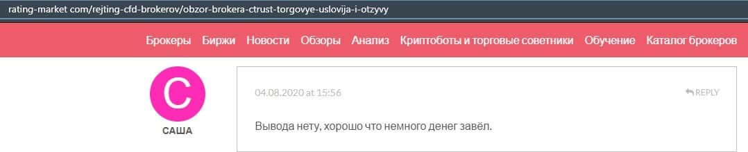 Потенциальный клиент рассказал в отзыве, как он чуть ли не стал жертвой мошенничества со стороны конторы СТраст. Он яро сопротивлялся, так как понял, что это фейковый брокер.