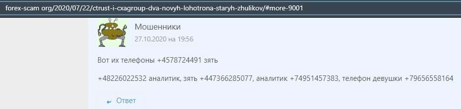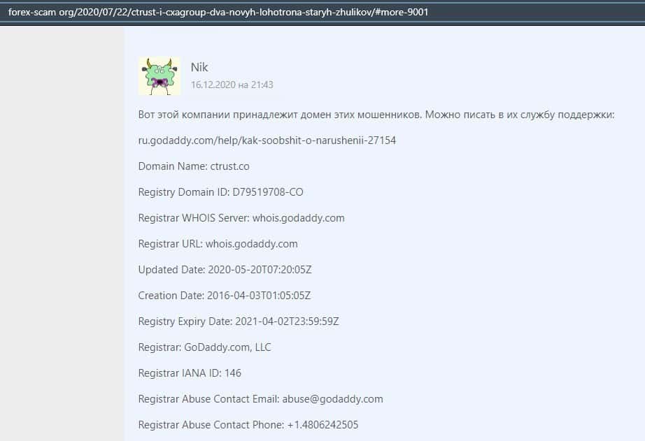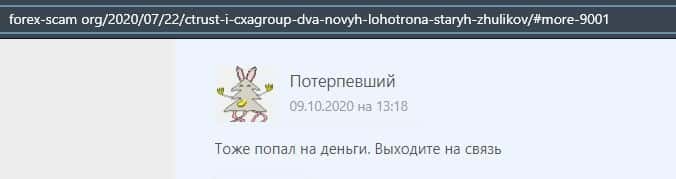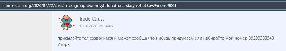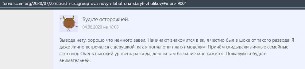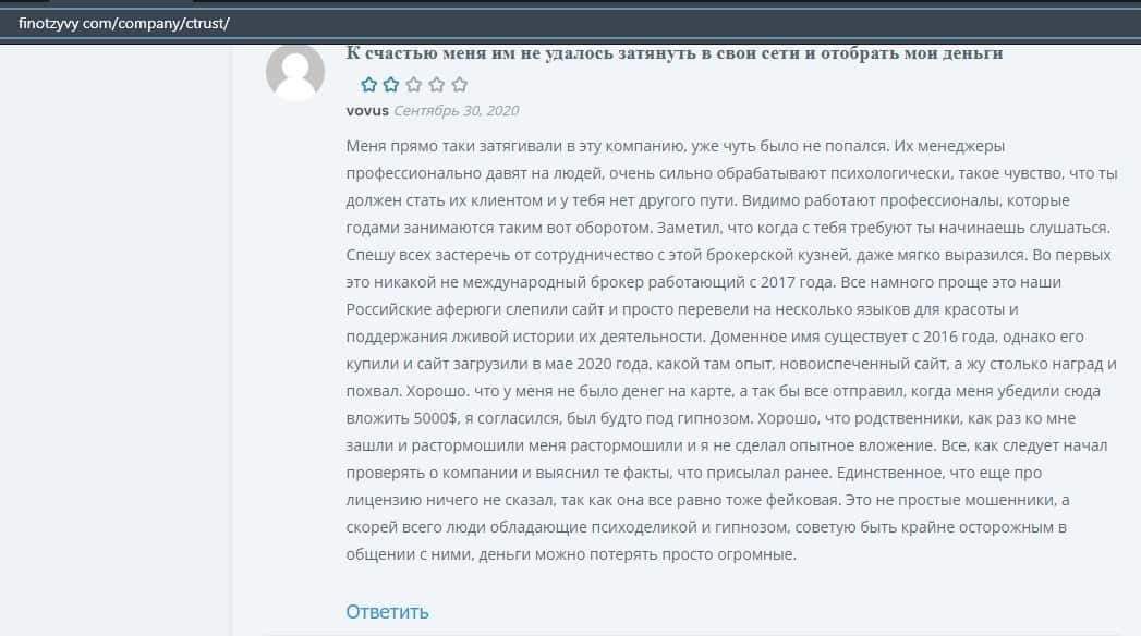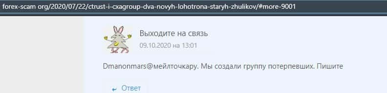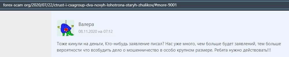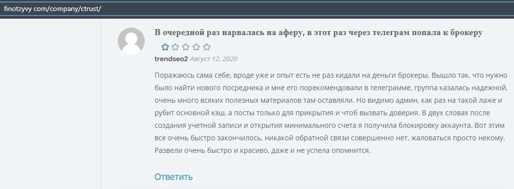 Пользователь сети опубликовал в своем отзыве, что форекс-контора CTrust Co кинула уже множество клиентов, поэтому они создали группу потерпевших и собирают все подробности.