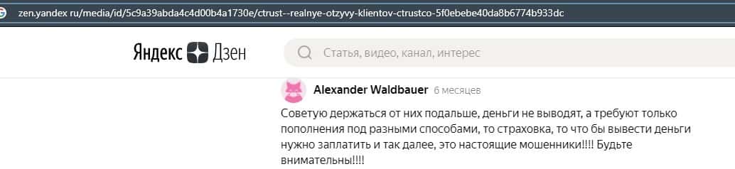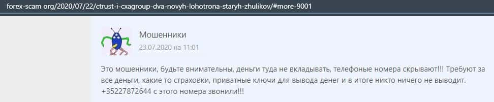 По рассказам еще одного бывшего клиента конторы CTrust Co, мошенники занимаются разводом клиентов и вывод средств у них не работает. В этом он смог удостовериться сам.