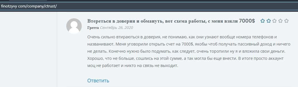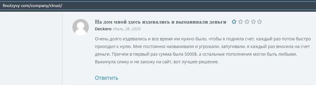 В данном отзыве сказано, что мошенническая контора CTrust Co не выводит деньги, а требует постоянно вложить новые суммы. Если вы откажитесь, то они начнут на вас давить.