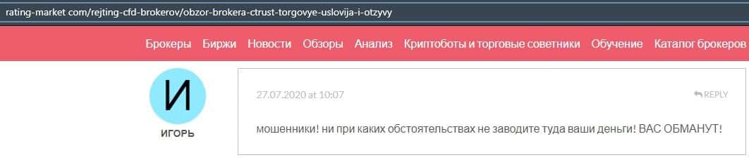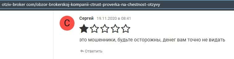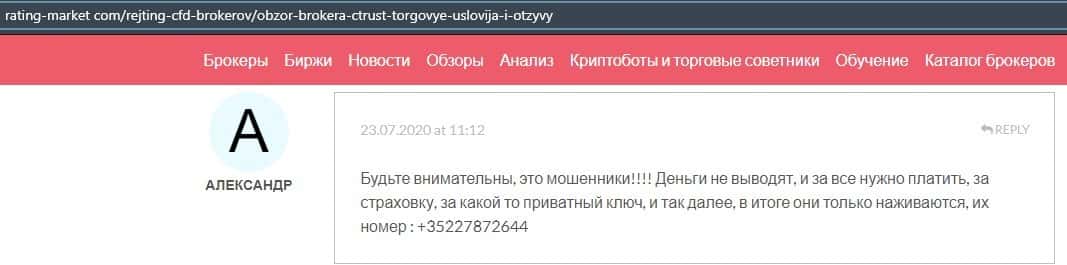 СТраст - очередной мошеннический оффшорный форекс-брокер, который обворовывает наивную клиентуру с помощью различных схем. В сети интернета уже много подтверждений того, что они украли у людей деньги, а также о всех признаках черного брокера. Жулики тесно связаны с известным лохотроном CXAGroup Net, который также кинул не мало людей. Поэтому настоятельно не рекомендуем связываться с этой аферой под названием CTrust Coю