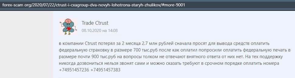 Ниже представлен еще один отзыв, который подтверждает, что форекс-мошенники СТраст вымогают у своих клиентов заплатить страховой депозит за вывод определенной суммы денег.