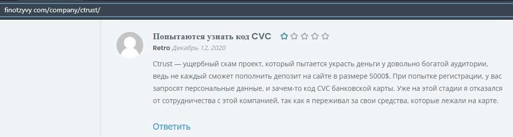 Далее представлена информация о форекс-лохотроне СТраст, которая всеми путями пытается выманить личные данные клиентов, вплоть до CVV-кода банковской карты.