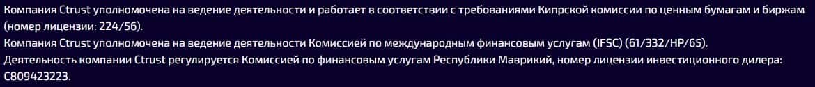 Исходя из представленных данных, контора СТраст якобы имеет лицензии от кипрского регулятора и регулятора Республики Маврикия, но нет ни одного доказательства этого факта.