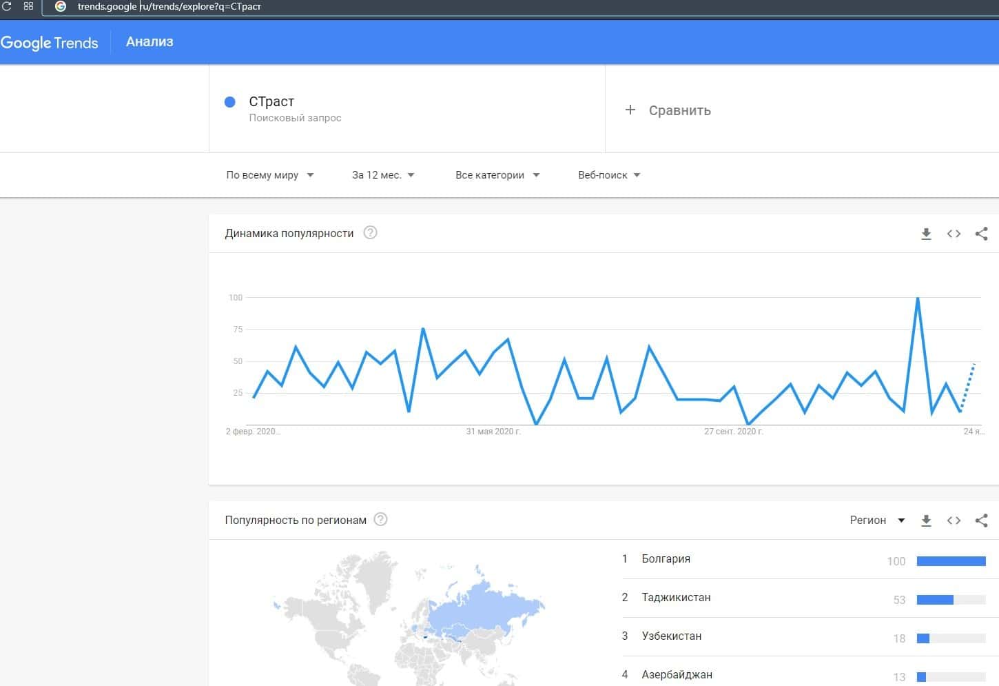 Как мы видим бренд "СТраст" в гугл-запросах довольно популярен и эти запросы исходят в основном из таких стран как: Болгария, Таджикистан, Узбекистан и Азербайджан.