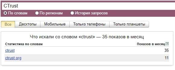 Немного других показателей касается англоязычного бренда "CTrust", который также, по версии интернет-ресурса сервиса Яндекс.Вордстат набрало 35 показов за последний месяц.
