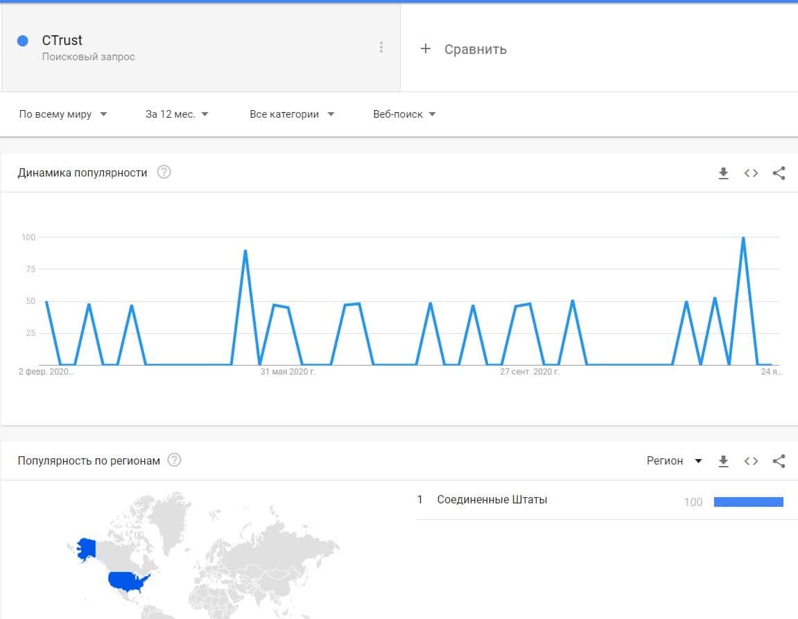 Что касается бренда форекс-конторы "CTrust", то здесь есть запросы, что говорит о его популярности среди англоязычных пользователей интернет-сети, а именно в США.