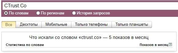 Бренд "ctrust.co" по версии сайта Яндекс.Вордстат также не отличился большим количеством запросов и этот показатель равен 5 запросам за последний месяц.