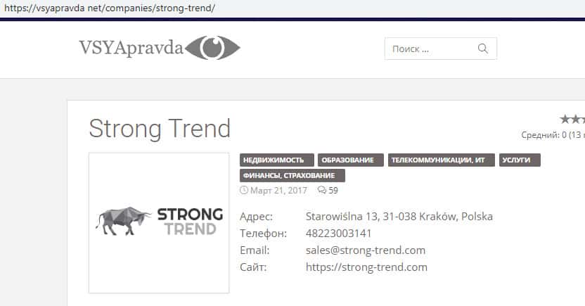 Так же благодаря порталу всяправда нет можно узнать данные проходимцев Стронг Тренд, а точнее контакты, которые аферисты Strong Trend использовали для связи со своей наивной клиентурой во время активной деятельности на просторах сети интернет. Итак ниже перечислим известные контакты для связи с проходимцами Стронг Тренд: