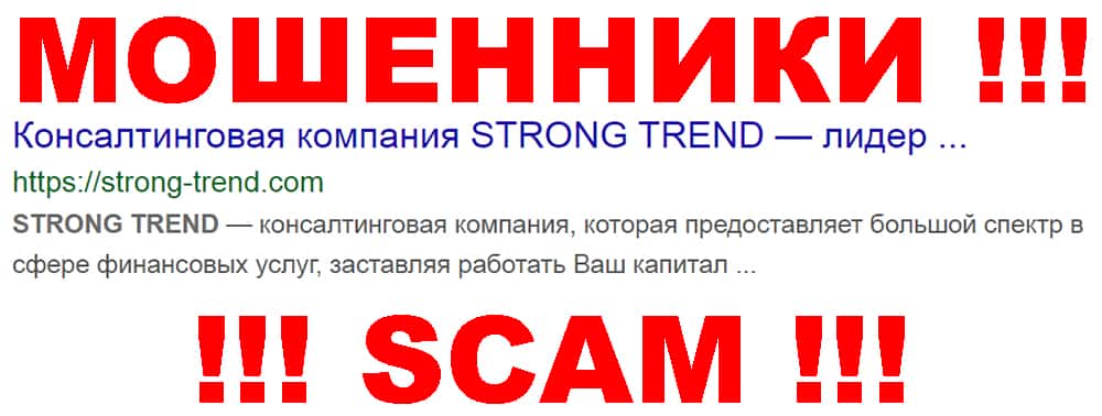 Стронг Тренд - очередные мошенники сети интернет, которые занимались наглым разводом наивных пользователей сети интернет под банальным предлогом торговли форекс, в ходе которой шулера Strong Trend кидали клиентуру, а после нагло и оперативно соскамились. В связи с этим сотрудничать с проходимцами по типу жулья Стронг Тренд не рекомендуем !!!