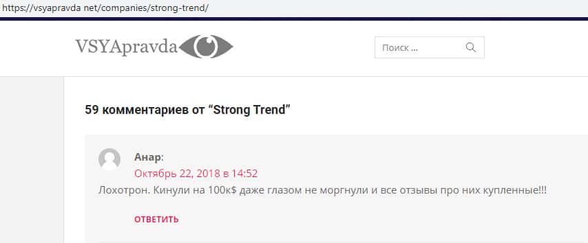 Если вдруг обманщики обворовали Вас, то в таком случае не дайте возможности, чтобы мошенники Стронг Тренд продолжали и дальше обманывать точно таких же доверчивых людей как и Вы в будущем, не забывайте делиться собственным прискорбным опытом.
