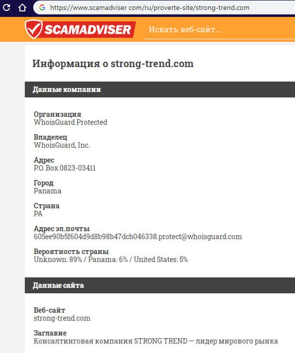 Техническую информацию о деятельности подвального сайта мошенников Стронг Тренд, а именно возраст, страну регистрации и местоположение сервера сайта аферистов Strong Trend, можно узнать непосредственно с помощью портала scamadviser com. На изображении, расположенном ниже, вы можете наглядно увидеть информацию о сайте шулеров.