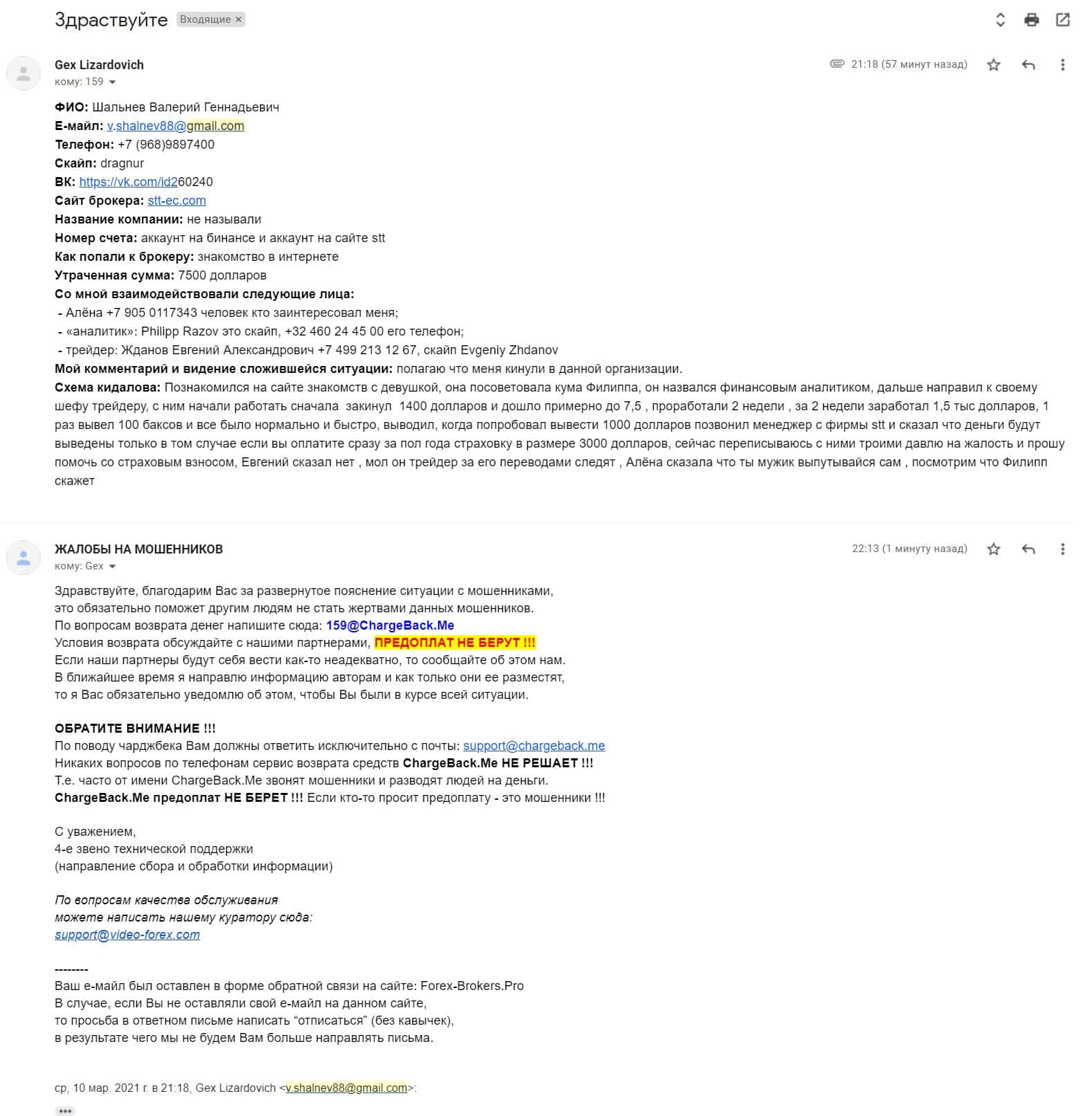 Мужчина оставил жалобу на брокера СТТ ЕС, в которой пишет, что эта организация кинула его на деньги. Он просит помощи в возврате утраченных средств.