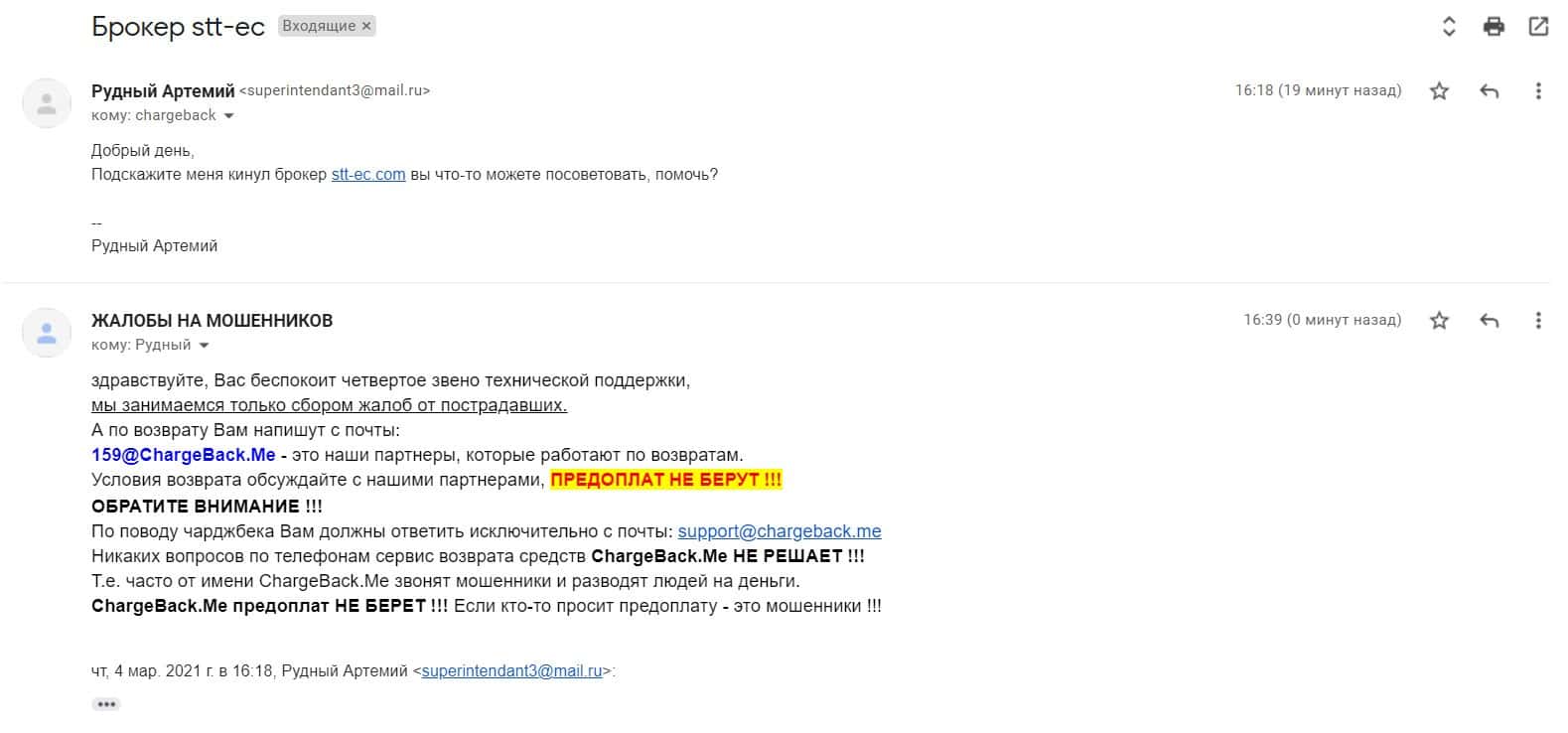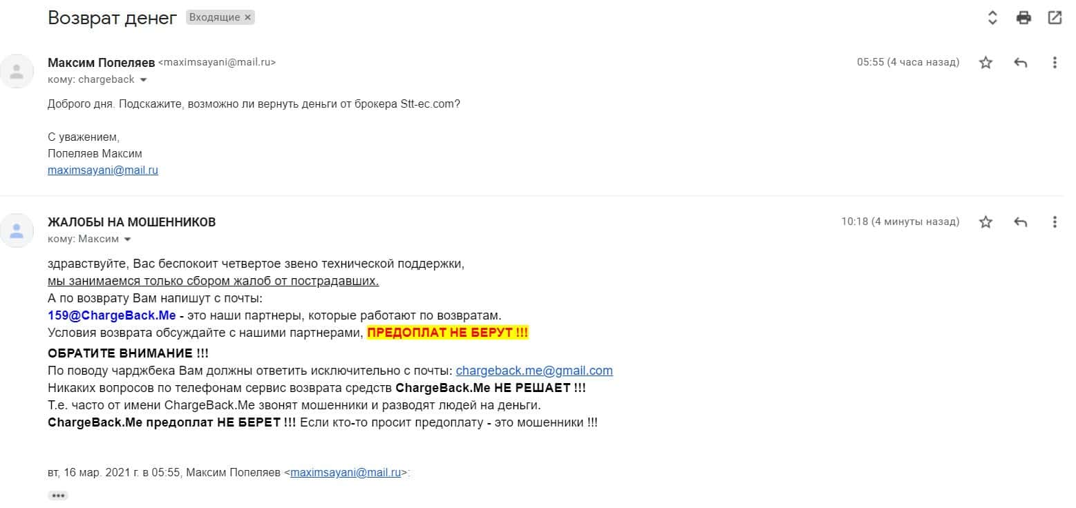 В данном разделе предлагаем увидеть информационный материал в виде жалобы на псевдо-брокерскую организацию СТТ ЕС, которая не вернула клиенту деньги.