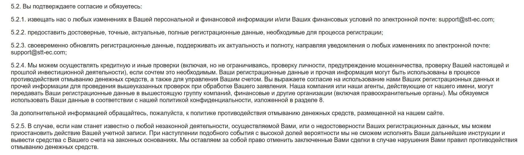 Раздел под номером 5.2 говорит о том, что контора STT EC может осуществлять проверки личности клиента и заблокирует его, если заподозрит в мошенничестве.