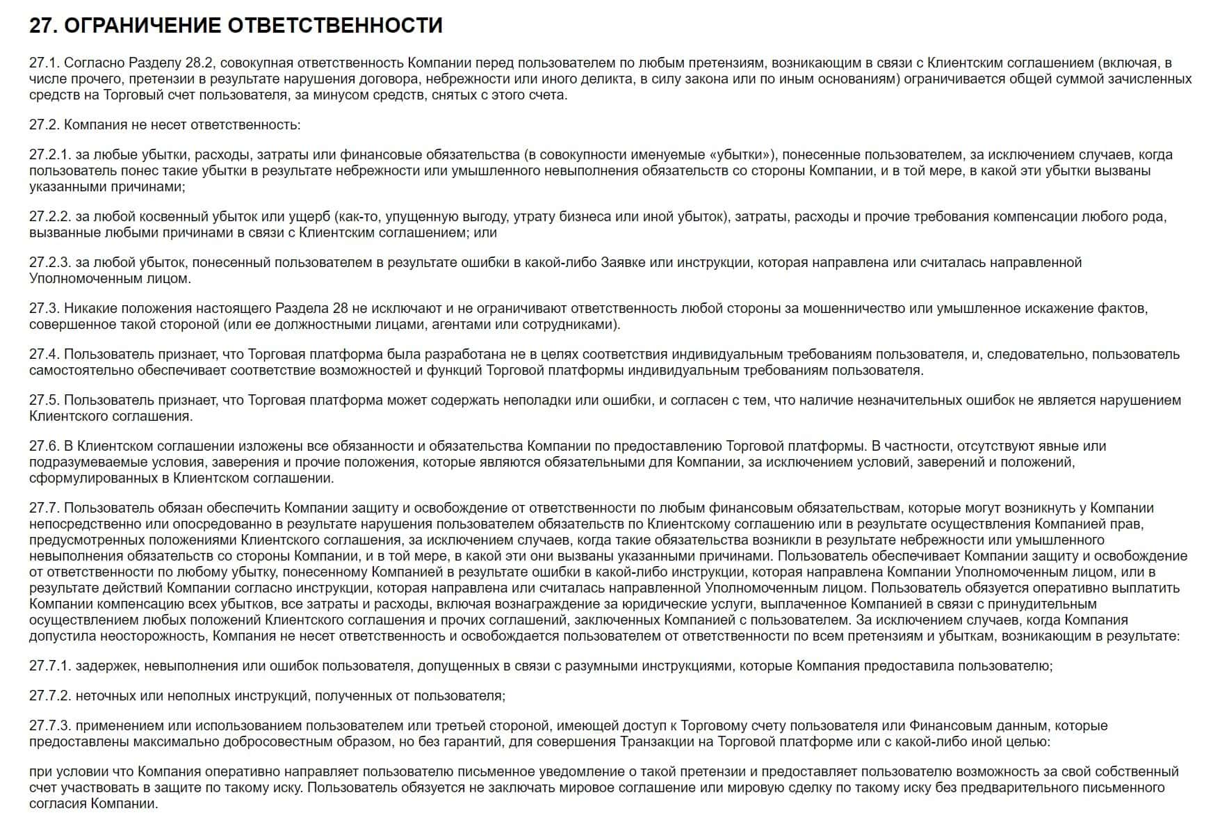 Раздел 27 предупреждает пользователей о том, что компания не несет ответственности за все убытки и любой ущерб клиента на их сайте.