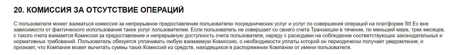 В разделе 20 пользователь обнаружит, что, кроме других комиссионных, брокерская контора STT EC будет взимать с него еще и плату за отсутствие операций.