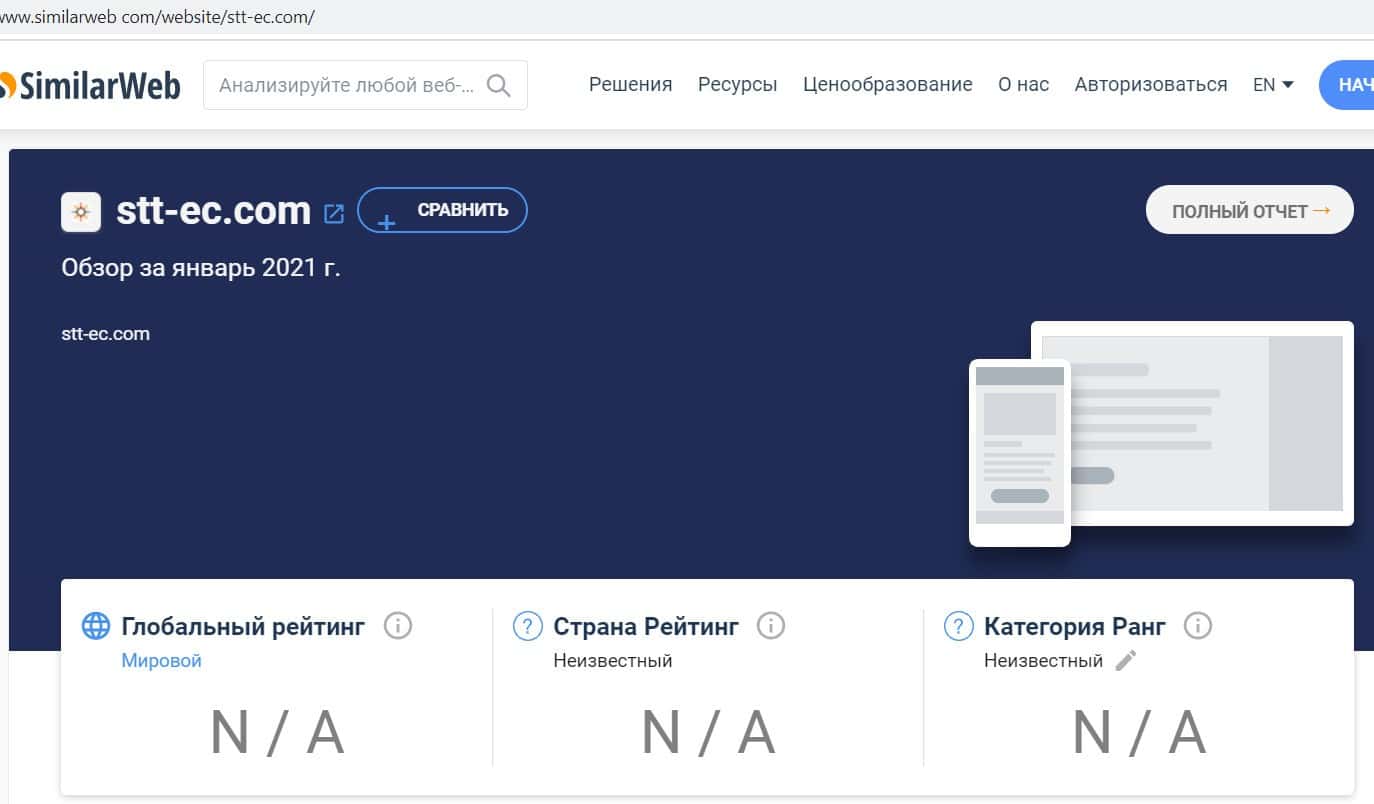 Сервис проверки компаний на посещаемость в интернете Симиларвеб не показывает абсолютно никаких данных о домене stt-ec com, видимо, он совсем новый.