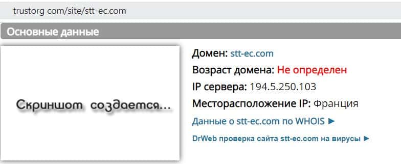 Сервис проверки доменов Трасторг не показывает информацию о домене stt-ec com, так как он не смог определить возраст сайта. Владельцы ресурса явно мошенничают.