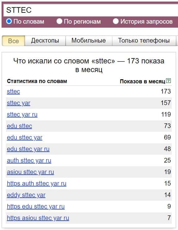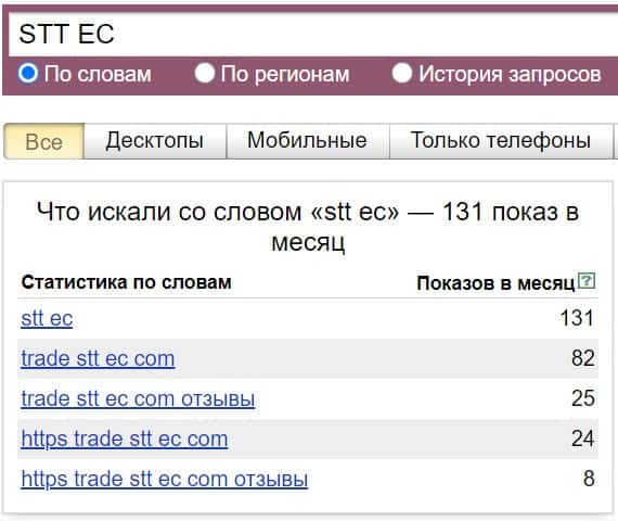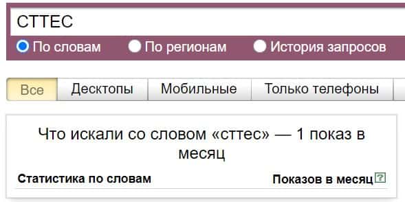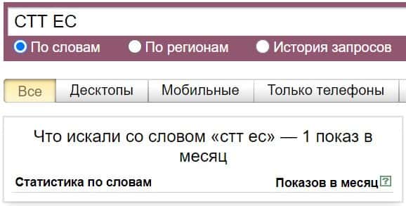То же название, но написанное с пробелом "СТТ ЕС", люди пытались найти в системе Яндекс с таким результатом: 1 показ в месяц.